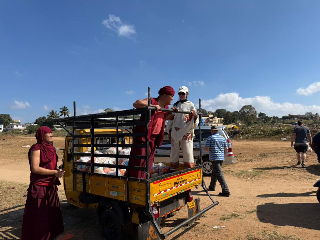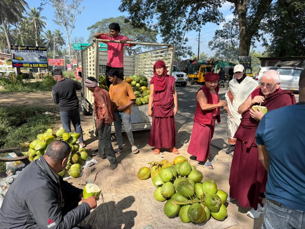 Below: Monks of Demna Khangsten (Loden Rinpoche’s college within Sera-Jey Monastery) offering food to those in need, stopping for coconut water, the newly planted Demna Khangsten forest